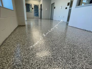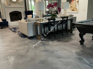 Maxwell Enterprise is a fully insured Decorative Concrete flooring company. We specialize in several types of floor coatings (Flake, Metallic epoxy, Quartz, Solid Color Epoxy), also Polished Concrete, Exterior Overlay/Stain, and we do Floor Demo/Concrete Prep.